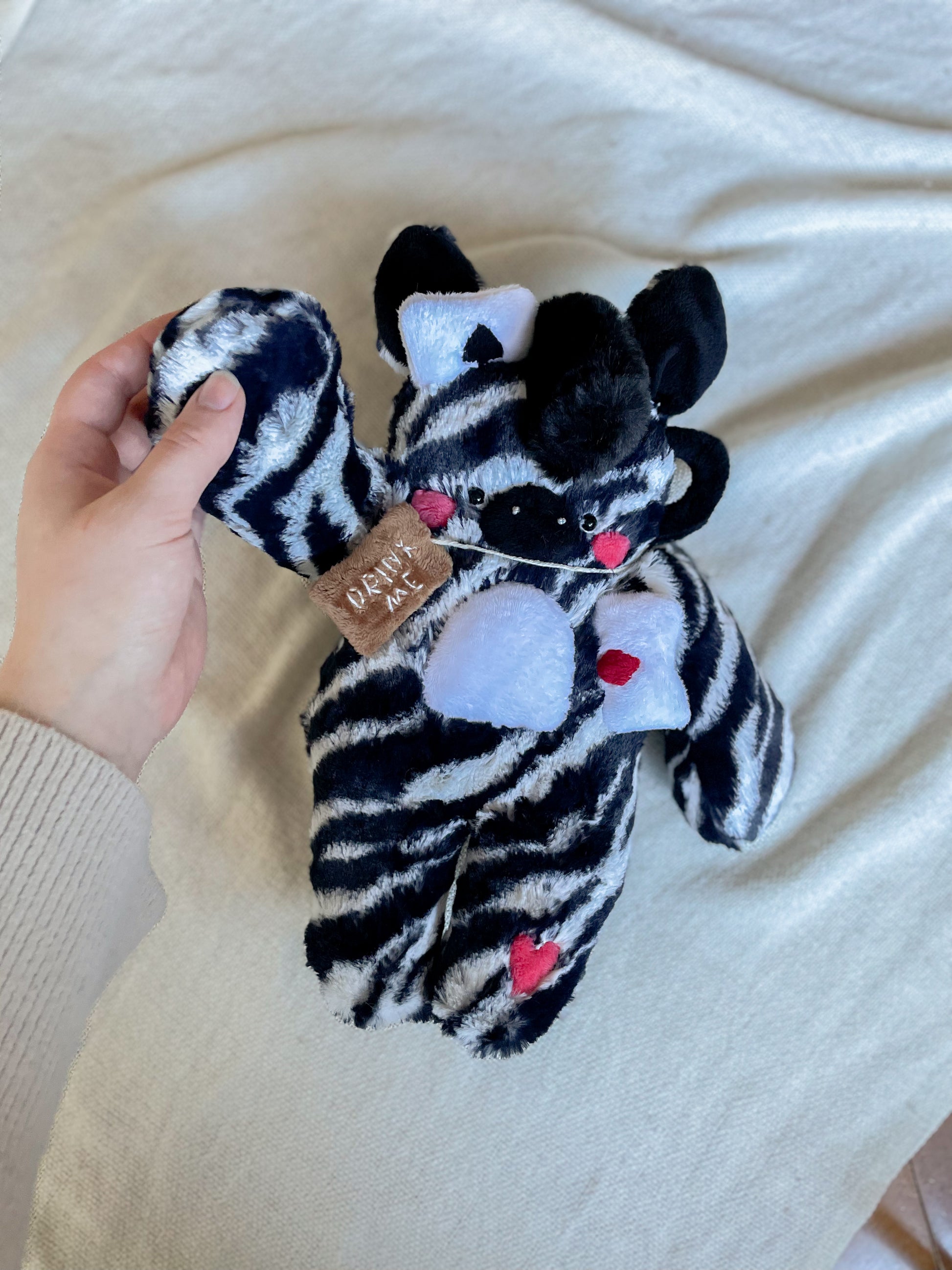 Details: Alice is loosely inspired by the Mad Hatters Tea Party from “Alice in Wonderland”… this is a little zebra that just had to join in the tea party! Sewn with high quality zebra striped Shannon minky fabric. Additional fabric details are made from smooth minky fabrics. Alice has two playing cards attached to her ( one space and one diamond). She also has a little black teacup handle, as well as a “drink me” tag around her neck (inspired by Alice in wonderland)